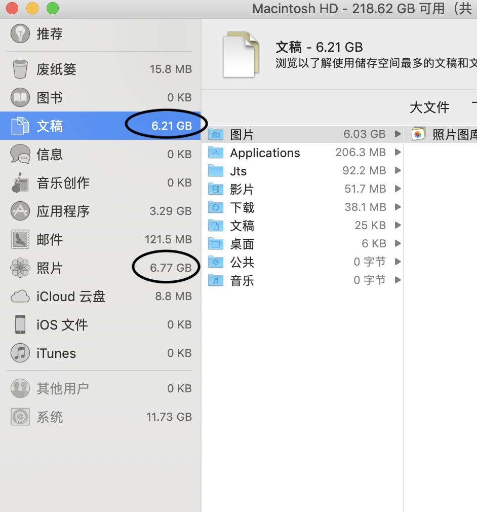 在 macOS 的管理储存空间这里应该算是显示重复了,你这里显示照片的 6.77 GB 其实和“文稿”中的照片图库所占用的是同一部分储存空间,只是在管理储存空间中为了便于区分进行不同分类显示而已。