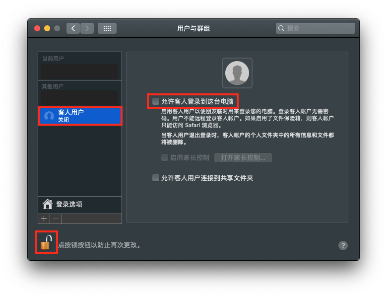打开“系统偏好设置”-“用户与群组”后先点击左下角🔒用管理员账户密码解锁,然后点击侧边栏中的“客人用户”去掉勾选“允许客人登录到这台电脑”