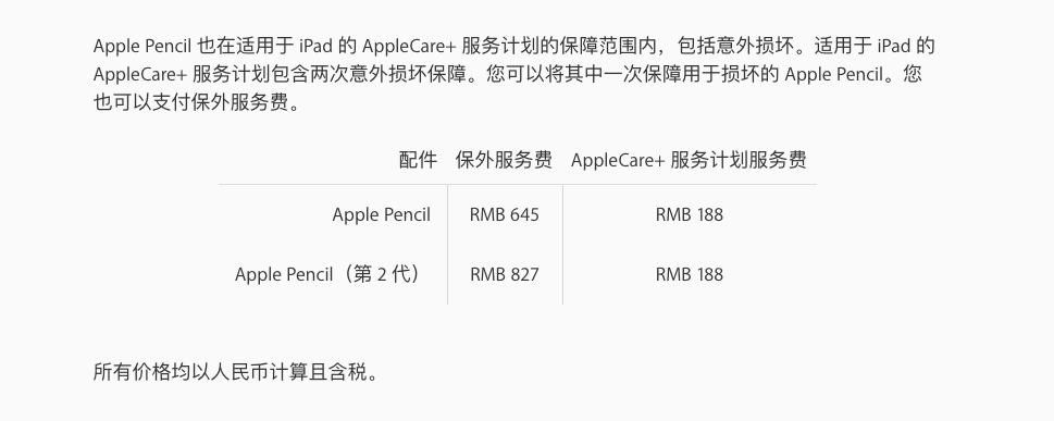 如果设备有Apple Care+费用RMB188,如果没有Apple Care+ ,Apple Pencil RMB 645,Apple Pencil(第 2 代)RMB 827
