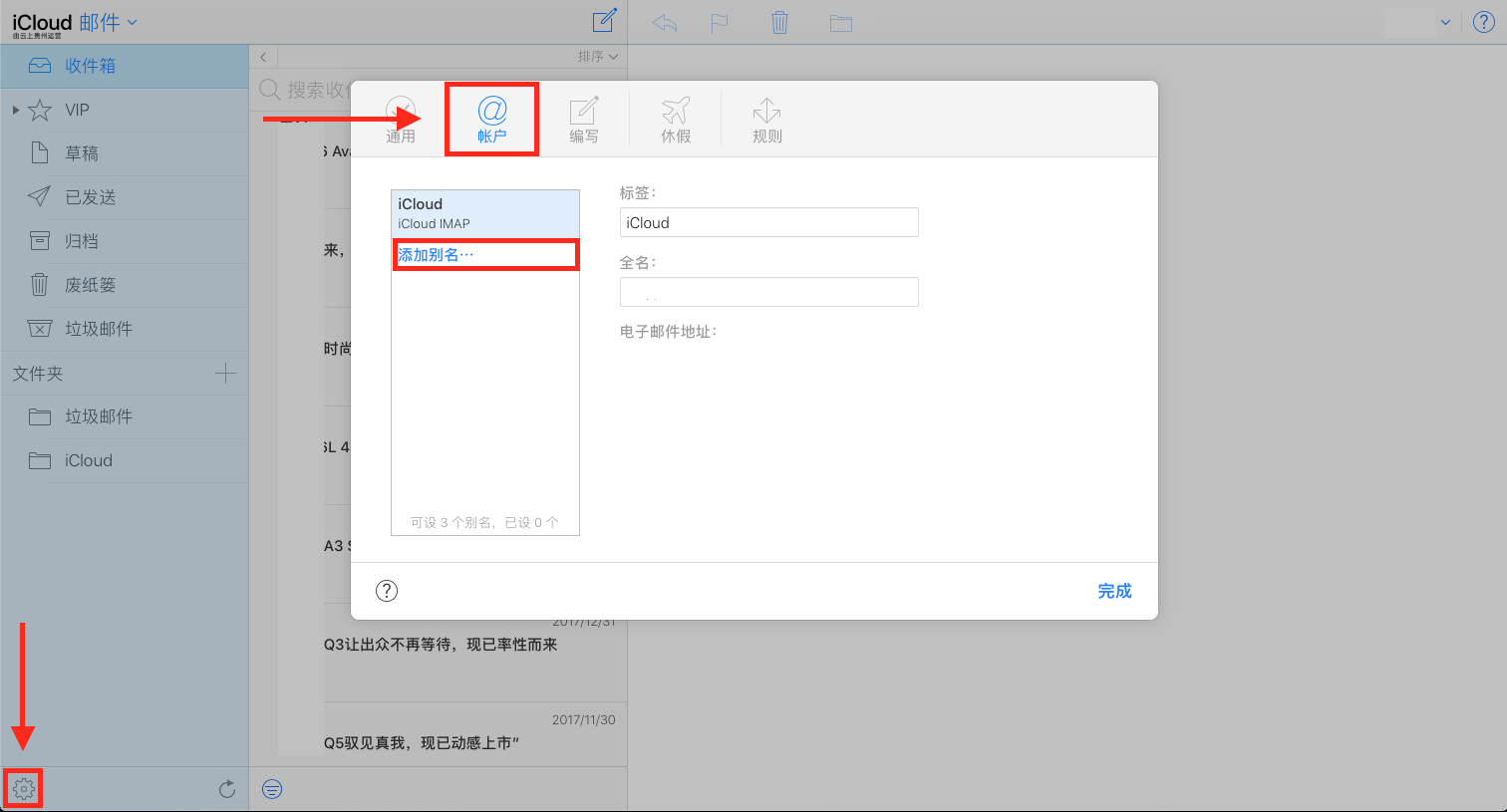 • www.icloud.com 登录 Apple ID - “邮箱”- 点击左下角齿轮按钮 -“偏好设置”-“账户”-“添加别名”