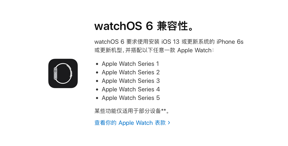 也就是说,仅当您的 Apple Watch 更新至 watchOS 6 后,与其搭配的 iPhone 才需要使用 iPhone 6s 或更新机型,并且运行 iOS 13 或更新系统。若您的是 Apple Watch 第 1 代,则其最新的 watchOS 版本为 4.3.2,但仍然可以与运行 iOS 13 的 iPhone 配对使用。