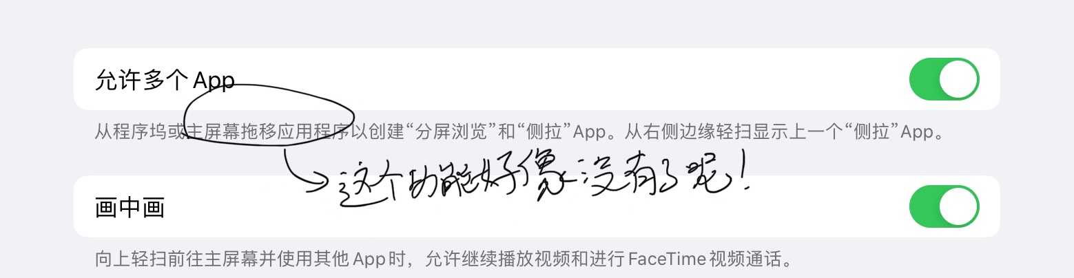 在iOS12的时候,应用分屏不止可以从dock栏拖拽分屏,还可以直接在主屏拖拽一个应用,再点选另一个应用,实现非dock栏中两个应用的分屏操作。升级到iPadOS之后,主屏拖拽应用会快速进入应用移动与删除操作中。目前只找到一个曲线救国的办法,将需要使用的两个应用(或应用所在文件夹)暂时拖入dock栏中,如果是同一文件夹,此时iOS12中熟悉的分屏操作依然可行。真的不想在dock中列一堆应用或者文件夹进去,希望得到官方的修正,或者寻求其他解决办法!