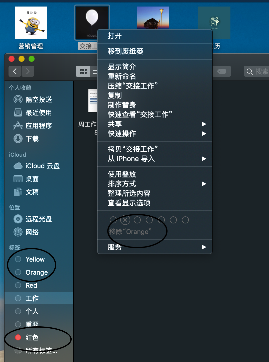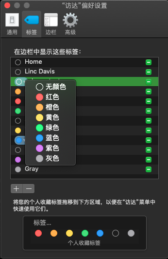标签的颜色和名称在Finder(访达)便好设置中设置,如下图的标签页中