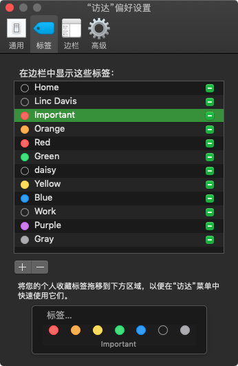将自定义标签从上面的列表中,鼠标按住并拖拽到下边,可以替换某个常用标签。比如下边的就是将系统原来的red标签,替换为Important: