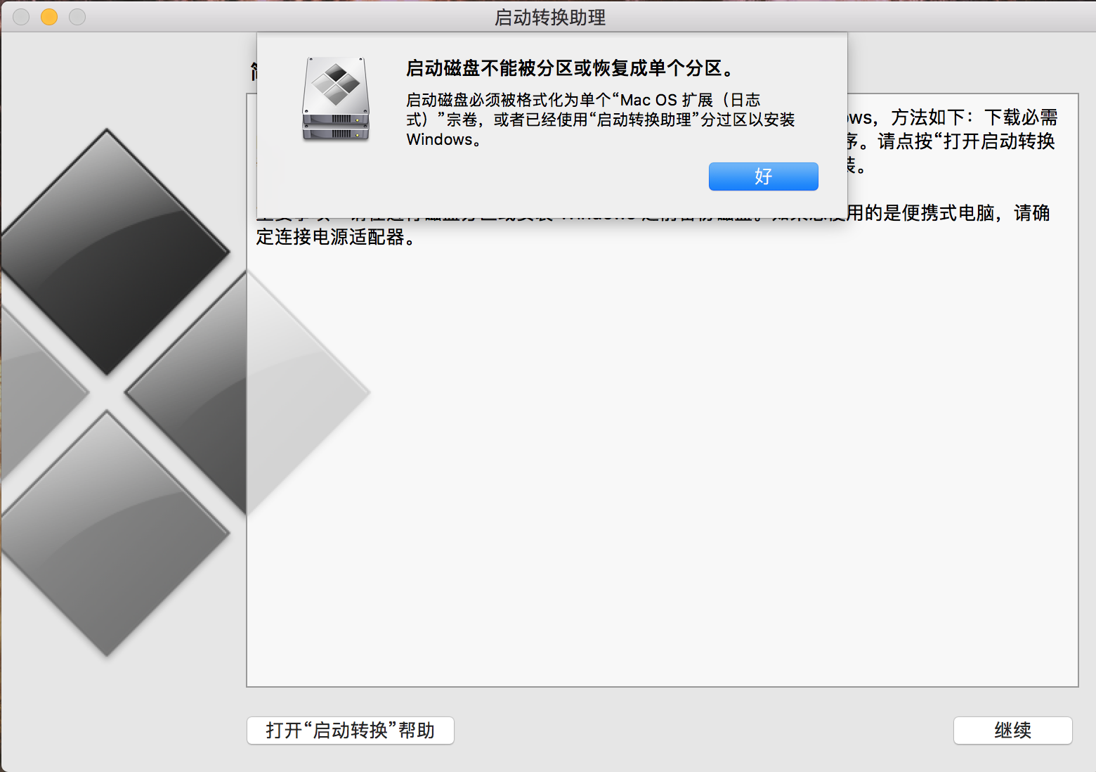 打开Boot Camp 之后,选择继续,跳出如下提示,无法进入任务选择栏,无法删除windows分区