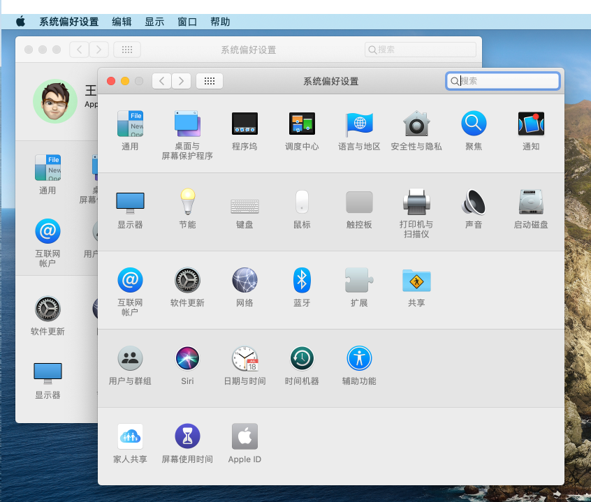 如:先从程序坞启动启动“系统偏好设置”,再在启动台中点击“系统偏好设置”图标,则可以唤起两个版本的系统偏好设置,如下图。