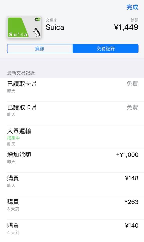 我了解到在您的 iPhone 上使用 Suica 卡搭乘公共交通后始终显示在”行程中“。目前,在任何能够使用 Suica 实体卡片或接受互通型 IC 卡片的地方,您都可以通过 Apple Pay 使用 Suica 卡乘坐交通工具。如果 Suica 卡已设为您的快捷交通卡,您只需在进站和出站时将 iPhone 的顶部或 Apple Watch 置于距离检票口扫描器几厘米的范围内即可。您的 iPhone 或 Apple Watch 必须处于开机状态,但不必连接网络。在进出检票口时,您无需唤醒或解锁设备,也无需打开应用。您会在显示屏上看到“完成”和一个勾号。