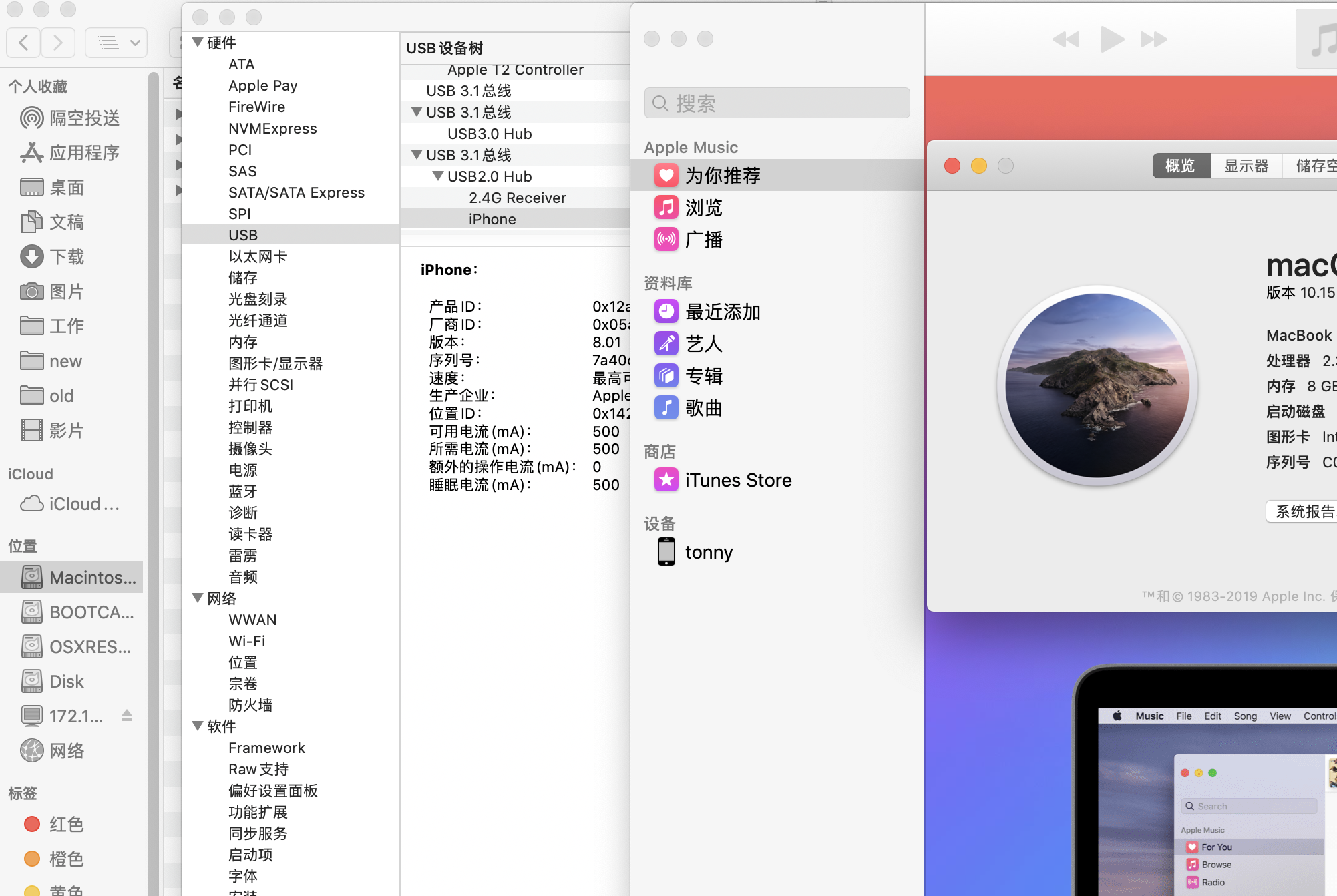 升级10.15后,通过USB-Lighting数据线连接Mac,finder左侧侧边栏不显示iPhone设备。但是“系统信息”内可以看到iPhone ,"音乐"、“照片”APP内都可以看到iPhone,