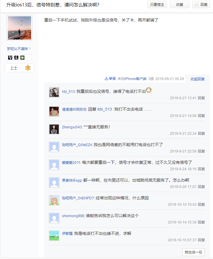 自从更新了IOS13,以前在家里还有4G信号,现在只有3G,必须要得用无线网,否则3g完全不满足使用。苹果能不能再出一个版本修复这个问题呢???