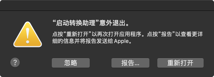 升级系统到最新 macOS Catalina 10.15 后,在连接雷电3接口硬盘的时候打开启动转换助理,点击继续,会闪退。10.14 不会出现这个问题,但是安装windows 的时候会报这个错误