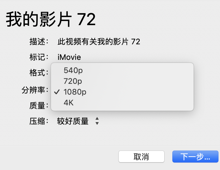 imovie导入4k画质视频导出只能选择720p