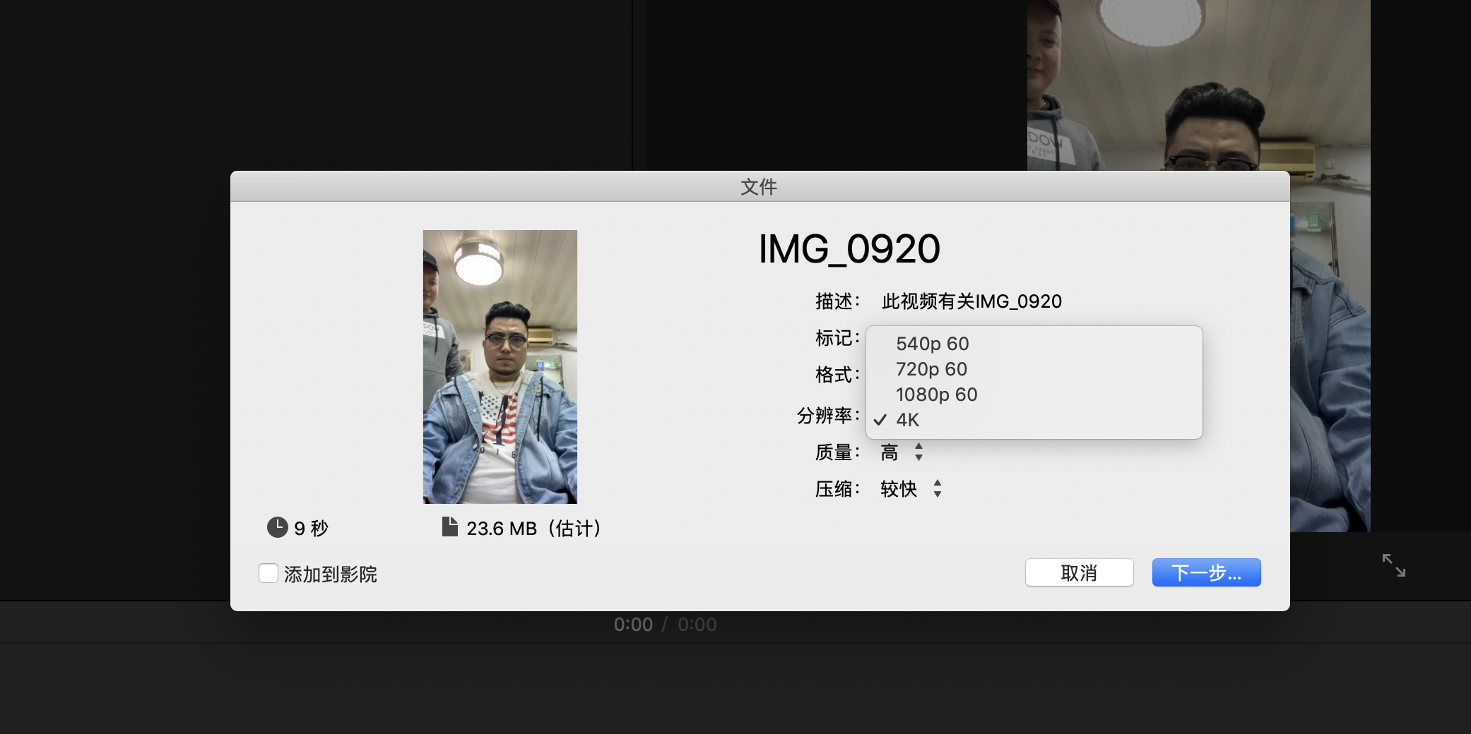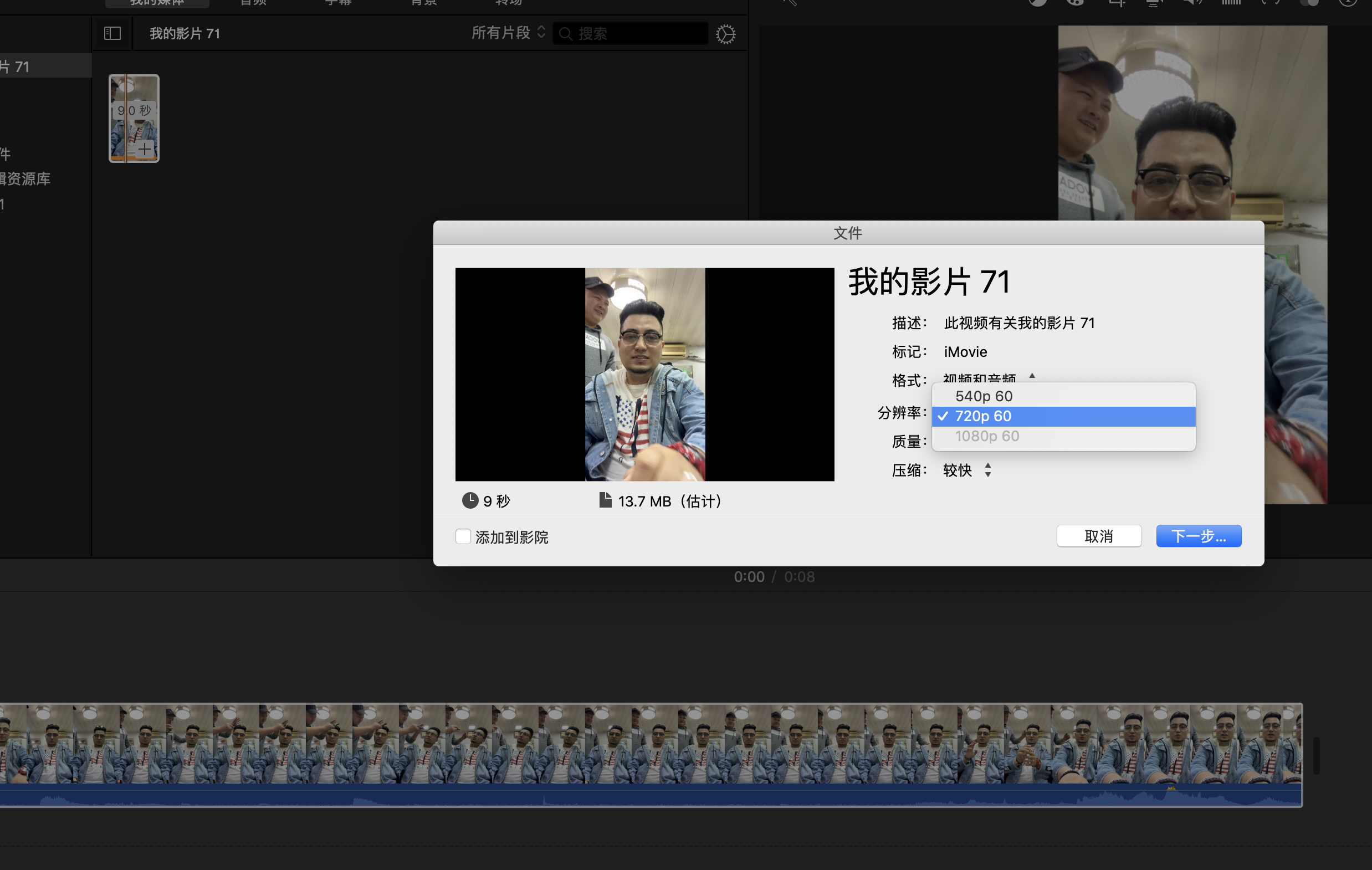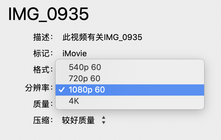 imovie导入4k画质视频导出只能选择720p60