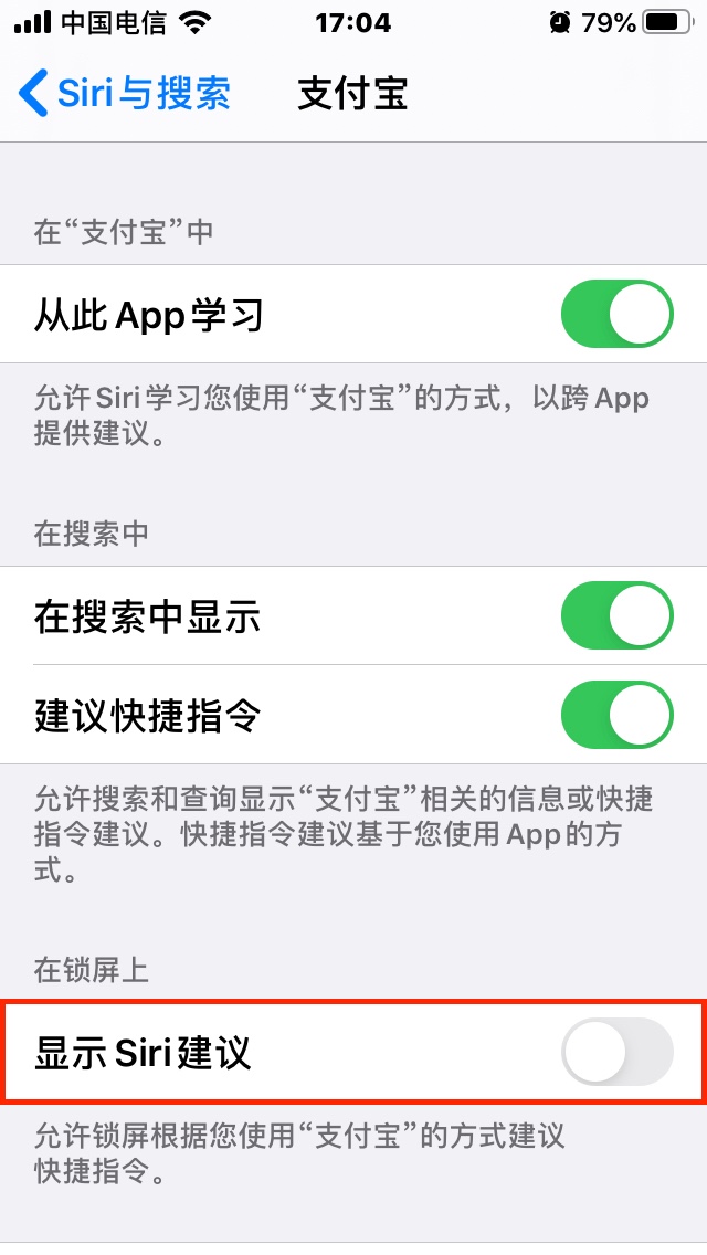我只是想把红框部分关掉,并且上面的“SIRI建议”中仍要有支付宝。