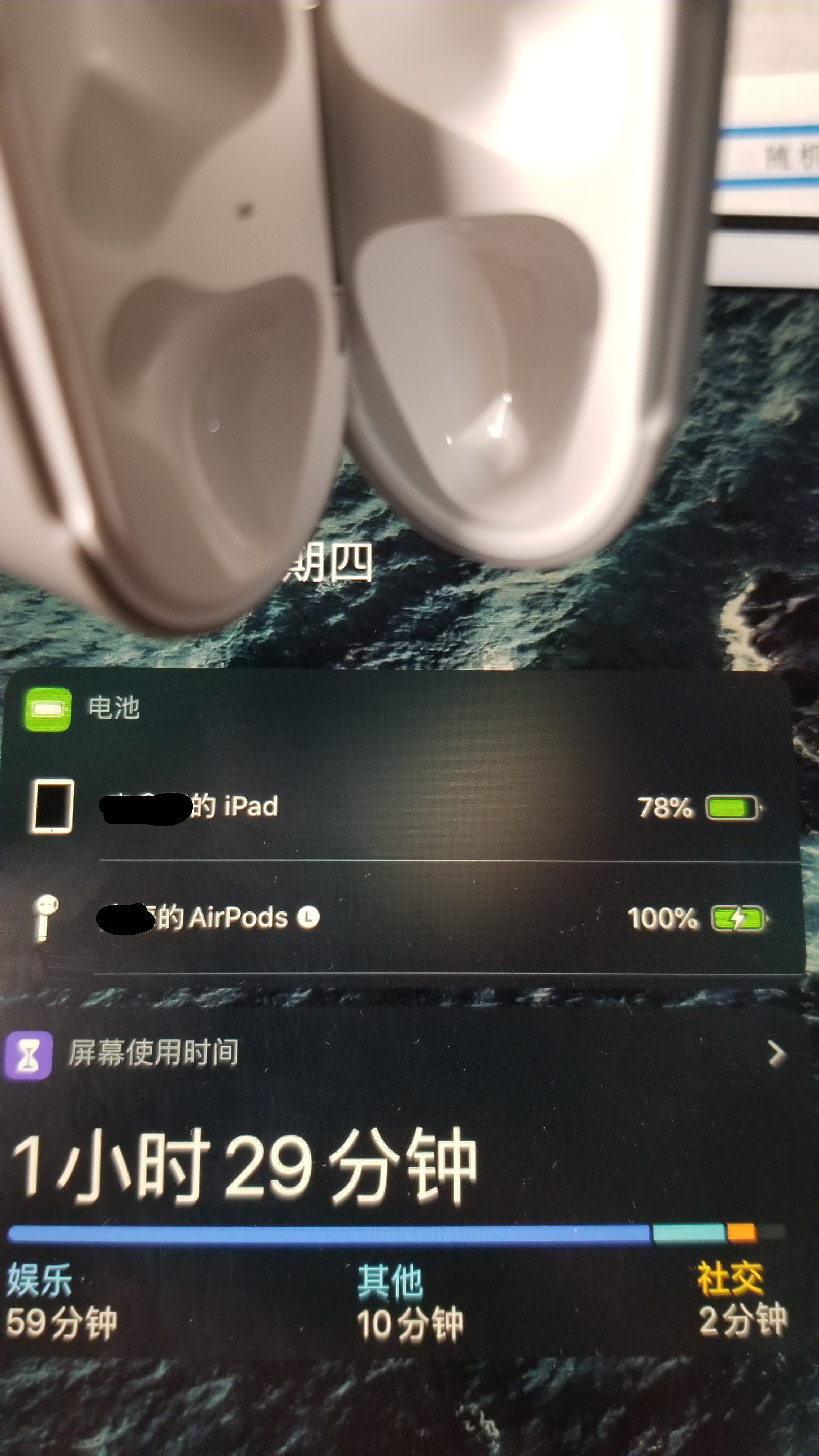 第二个问题就是拿出来之后手机上面还一直显示airpods在充电。两个耳朵有的时候一个在充电一个不在,但是两个都拿出来了。