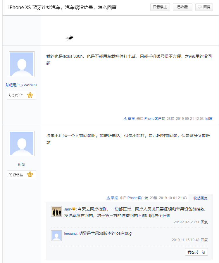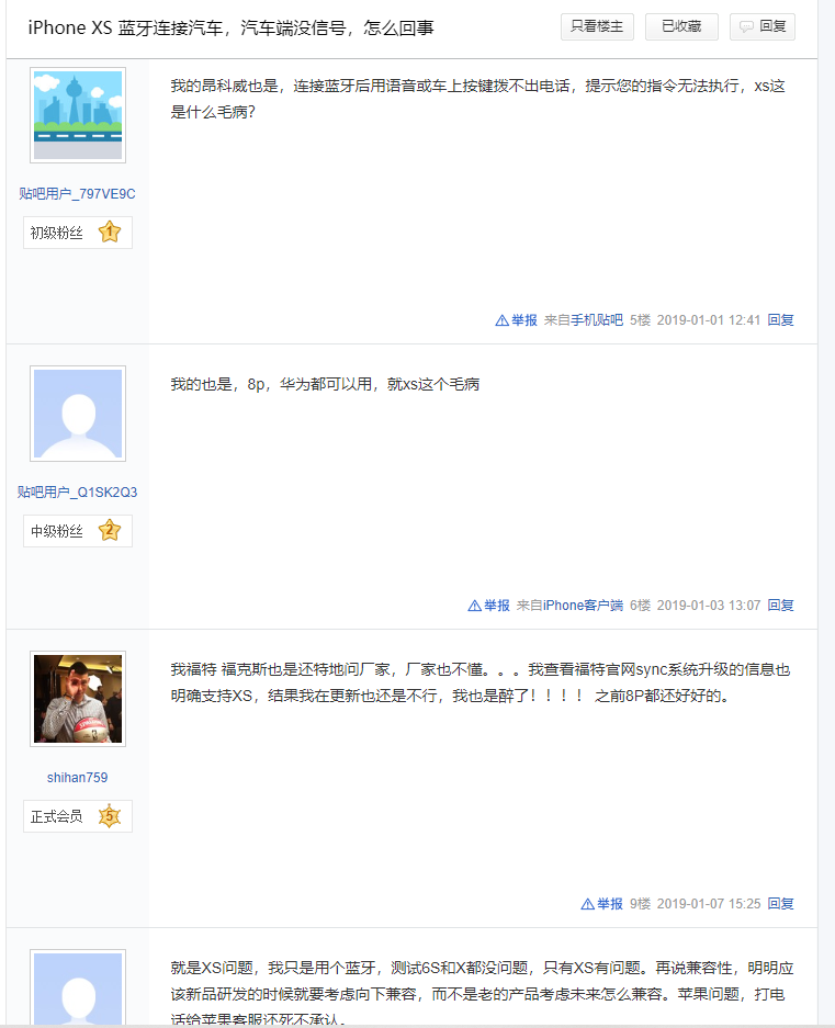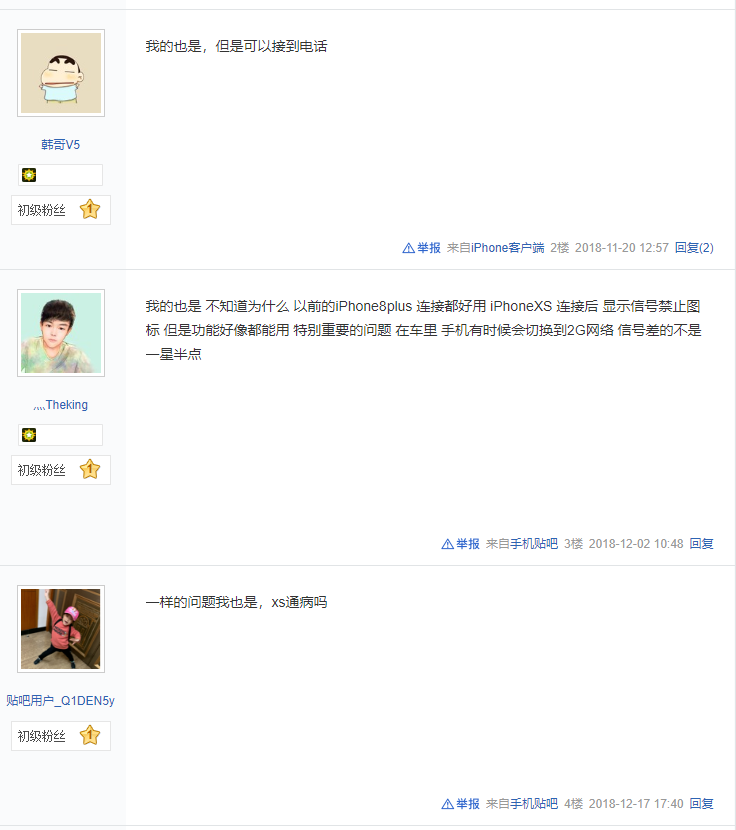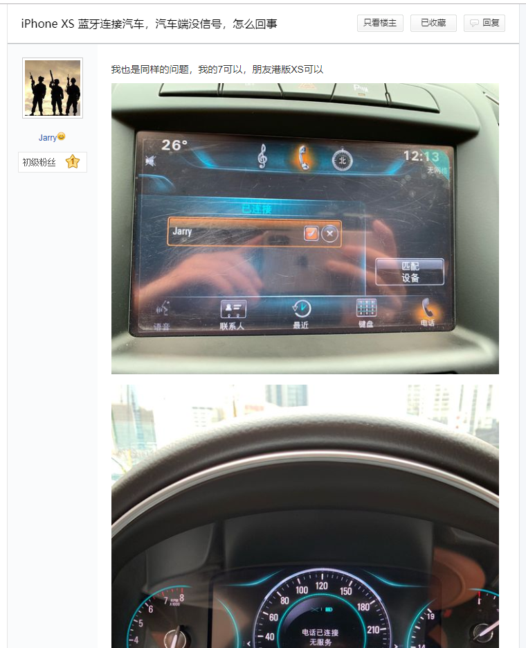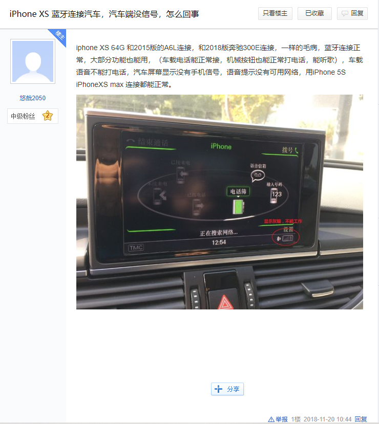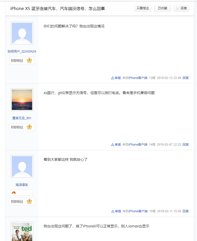 经过网上查询,出现此问题的人数不少,大家都出现了蓝牙连接车机后,车机显示“无信号”,并且手机都是iphone xs的国行版本,在换了其他iphone之后,都可以正常显示。时间跨度从2018年初至今,都没有得到修复。我截取了一些网友反应的问题如下,希望得到相关技术人员的重视并尽快修复,非常感谢!