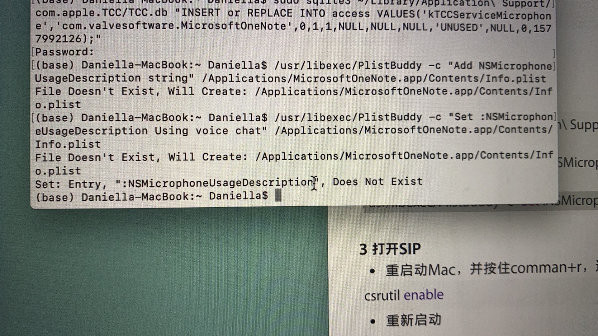 不过我刚才试了一下。第三行代码中没办法找到NSMicrophone 然后我就退出命令行了。不过我在恢复模式里面enable了一下。word和onenote的麦克风功能都打开了。