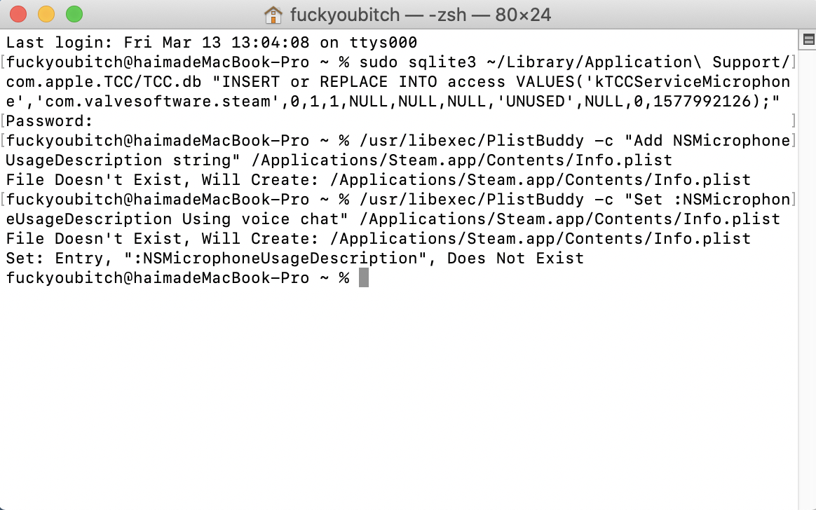 sudo sqlite3 ~/Library/Application\ Support/com.apple.TCC/TCC.db "INSERT or REPLACE INTO access VALUES('kTCCServiceMicrophone','com.valvesoftware.steam',0,1,1,NULL,NULL,NULL,'UNUSED',NULL,0,1577992126);"
