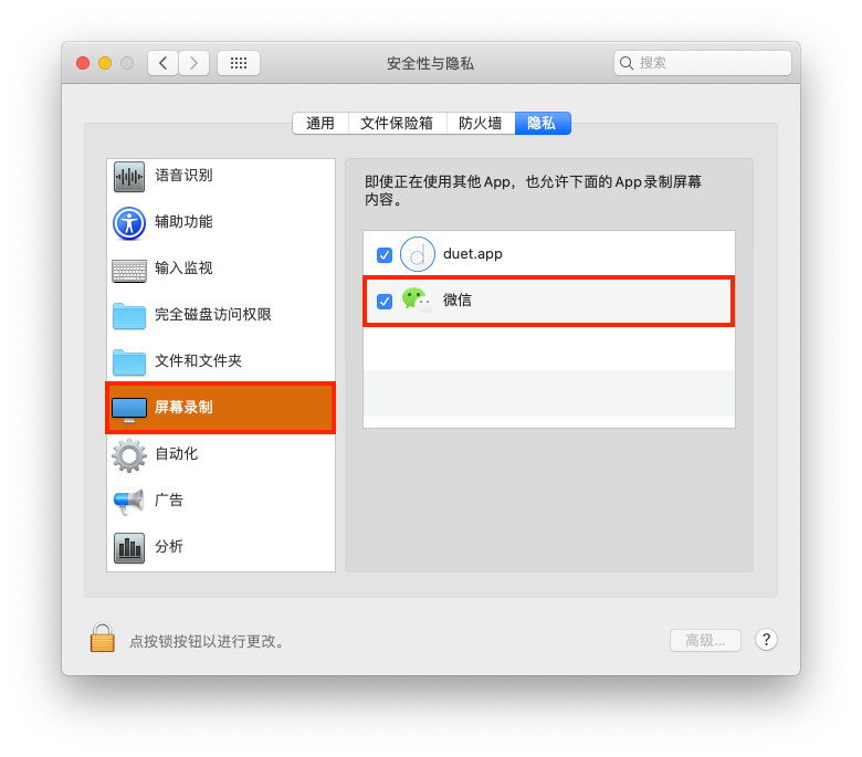 问题被标记为 排名最靠前的回复 以下用户的用户个人资料: 亲爱的璞璞 亲爱的璞璞 用户级别: 级别 6 11,551 积分 2019年11月26日 上午6:24 回应 一笑226 这个检查下“系统偏好设置”-“安全性与隐私”-“隐私”-“屏幕录制”中确保“微信”App 出于勾选打开状态。 回复 链接