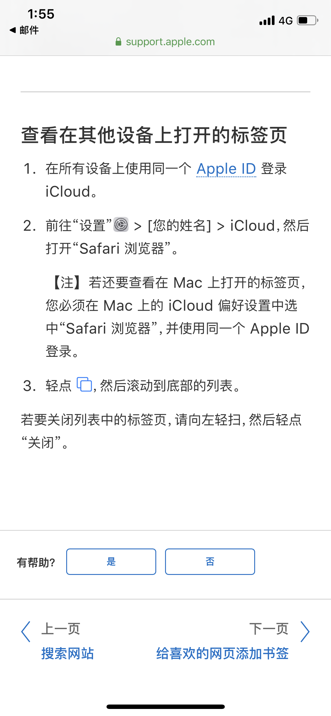 针对您的 iPhone 与 Mac 仍然无法使用 iCloud 标签页,建议您参考以下技术支持文档中的步骤: