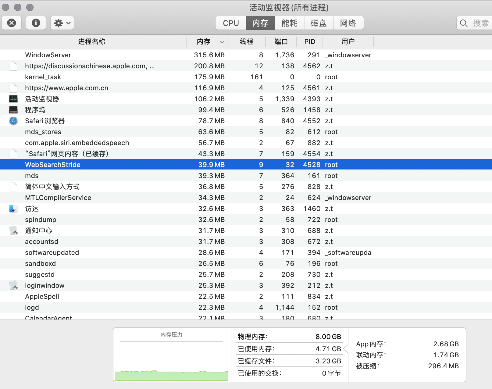 针对您的活动监视器中的 WebSearchStride 进程。建议您备份好 macOS 的数据,尝试抹掉磁盘重新安装 macOS 系统: