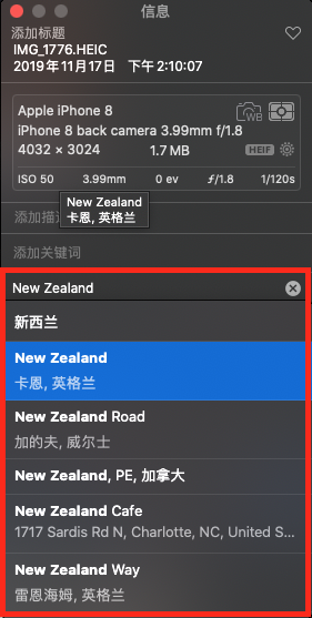 1、由于一部分照片是以前用老式相机或老式手机拍摄的,照片不包含位置信息,因此我想手动添加位置信息。但是,当我在照片app中输入位置时,对于国外的地址它不予识别,也不接受。例如,我输入“新西兰”,它自动弹出的全部是中国境内的相关词地址,即便我强行输入我的地址(包括用英文尝试),回车后也是空白。请问如何才能输入国外地址?