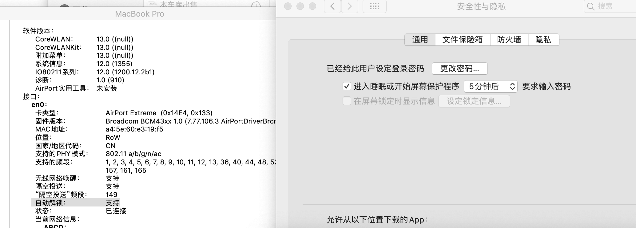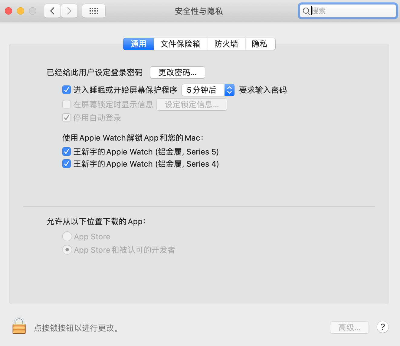 在“安全性与隐私”中没有“使用您的 Apple Watch 解锁 App 和 Mac”或“允许 Apple Watch 解锁 Mac”的选项,只有三个选项,分别是更改密码、修改睡眠时间和屏幕锁定信息。