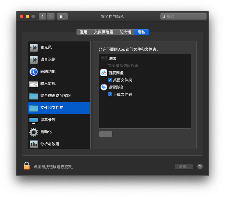 这个是macOS 10.15 Catalina的最新安全功能,当一个程序要访问用户目录时,系统会默认阻止这种行为,直到用户明确确认准许。一般滴会弹出一个对话框,提示用户是否准许访问一个文件夹(你的情况就是下载文件夹),如果用户错过或者选择No,那么这个程序就无法访问。要想改变,见下图所示,把该程序(迅雷影音)下方的要访问的文件夹(下载文件夹)前面打勾,就准许其访问了: