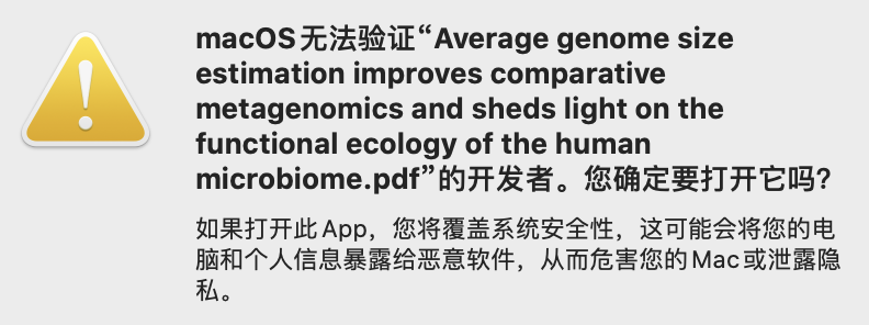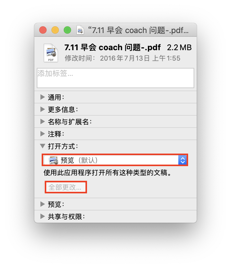 首先确认这个文件是安全的,更改 PDF 文稿的默认方式可以在右键菜单中打开“显示简介”然后在“打开方式”里选择“预览”再点击“全部更改”