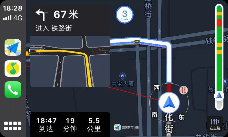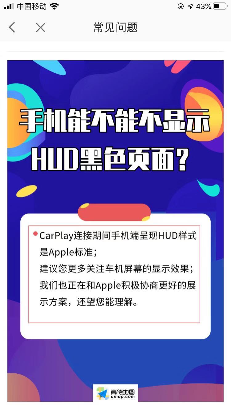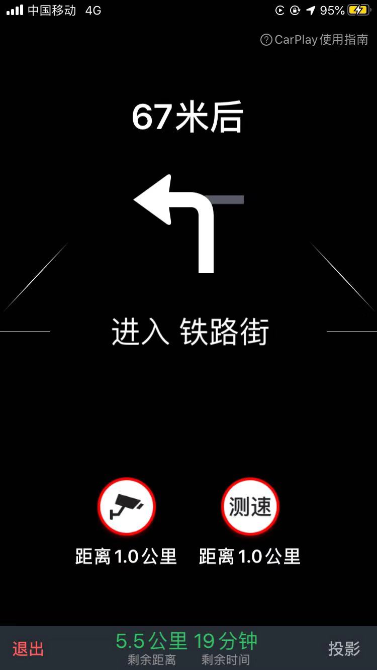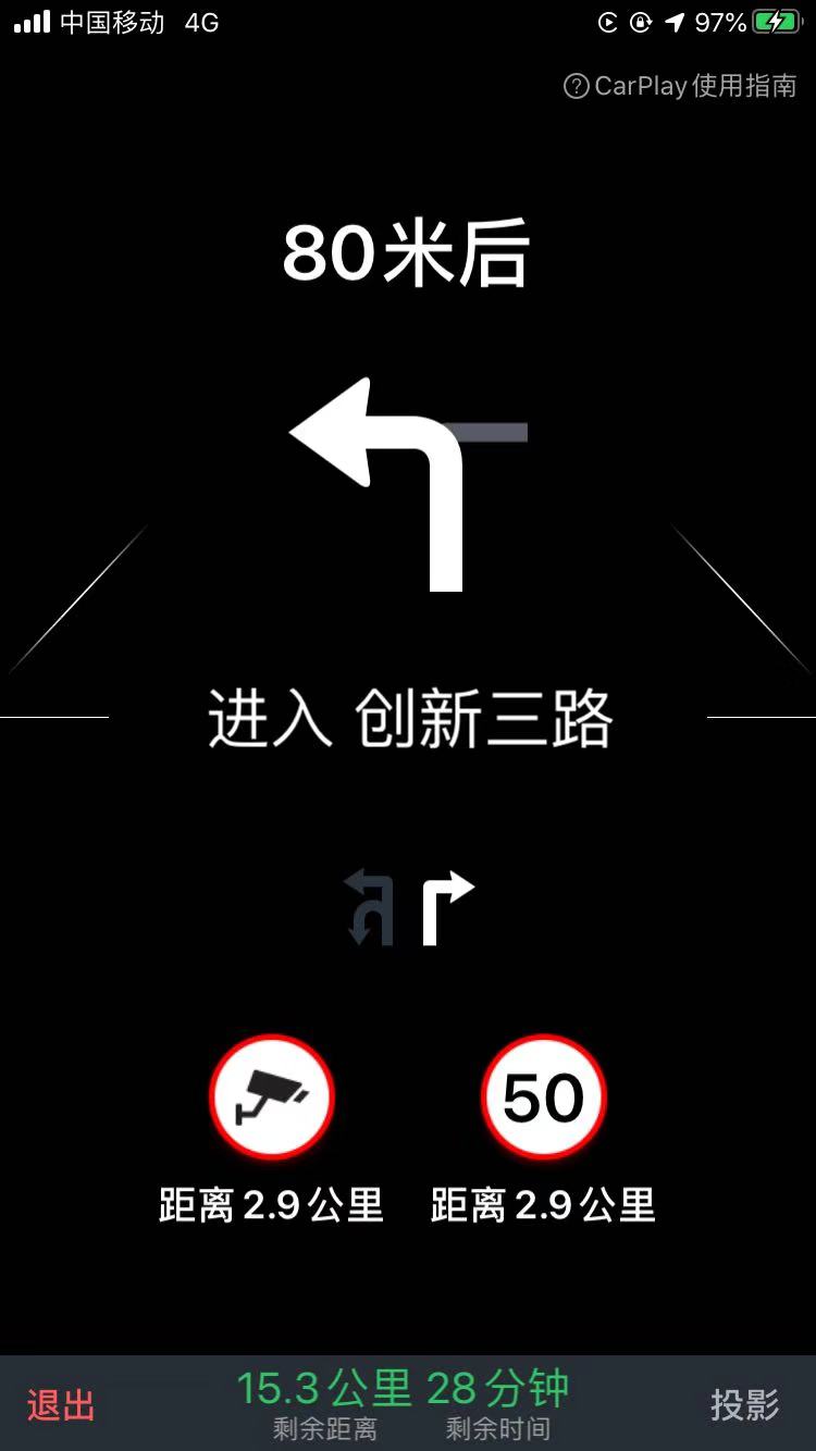 车型大众迈腾18款2.0T,照片1是ios13.3打开高德地图连接车载互联carplay,但车载屏幕没有点击高德,手机端显示的画面,手机端已经变成黑色背景、箭头和剩余米数。
