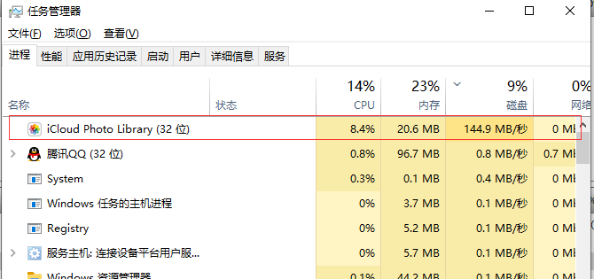 这两天我发现硬盘灯一直闪烁,我也没下载东西。看进程发现icloud photo library 这个进程一直在以 110-160M/S写入数据,具体写入什么不得而知。在资源管理器里看得写入的