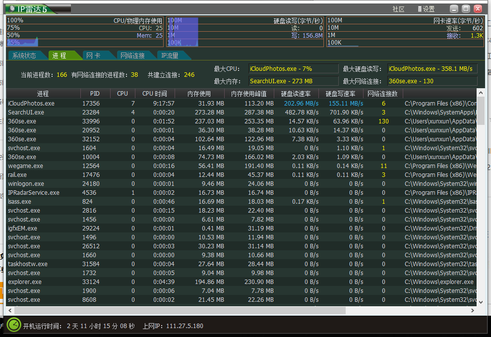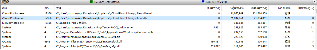它连续写入的就那两个文件 大小没变过。一个18M 一个 就几兆 但是连续的写入是真实的。通过软件检测 他已经在我开机的22个小时里写入了9个T的文件内容。我的硬盘总量才256G 也就是说他是反复删除写入删除写入 再更新文件。 我并没有打开同步。他在22个小时内的网络下载数据仅仅才5M左右。他的最大瞬时读写 350M 这是啥概念,我感觉他在偷偷读取我本地其他我没允许读取的媒体数据。但根据文件的监控又没有。只不过就两个文件C:\Users\xunxun\AppData\Local\Apple Inc\iCloudPhotoLibrary\client.db-wal 和C:\Users\xunxun\AppData\Local\Apple Inc\iCloudPhotoLibrary\client.db 我就是想单纯的知道 这俩文件到底干嘛的。为何能这样频繁的写入。而且我删过后又形成。依旧这样写入。