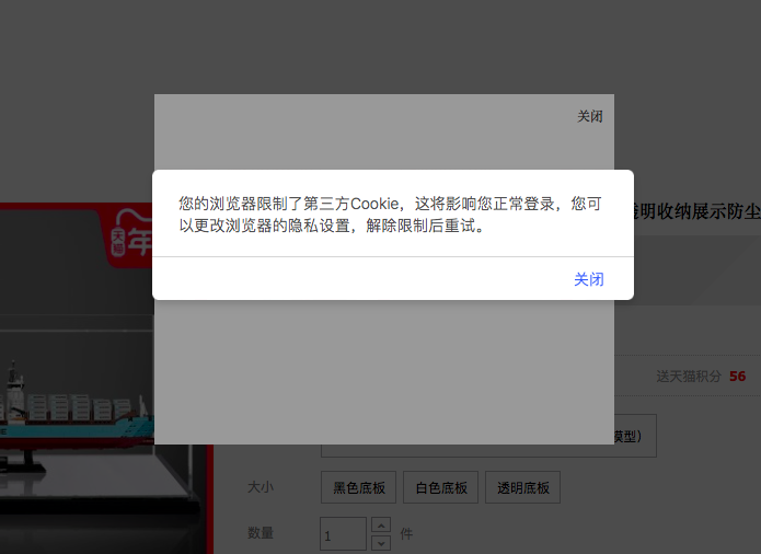打开淘宝网站可以,但是点击某一个商品的时候,就会先跳出来一个对话框:您的浏览器限制了第三方Cookie等等一大串文字。