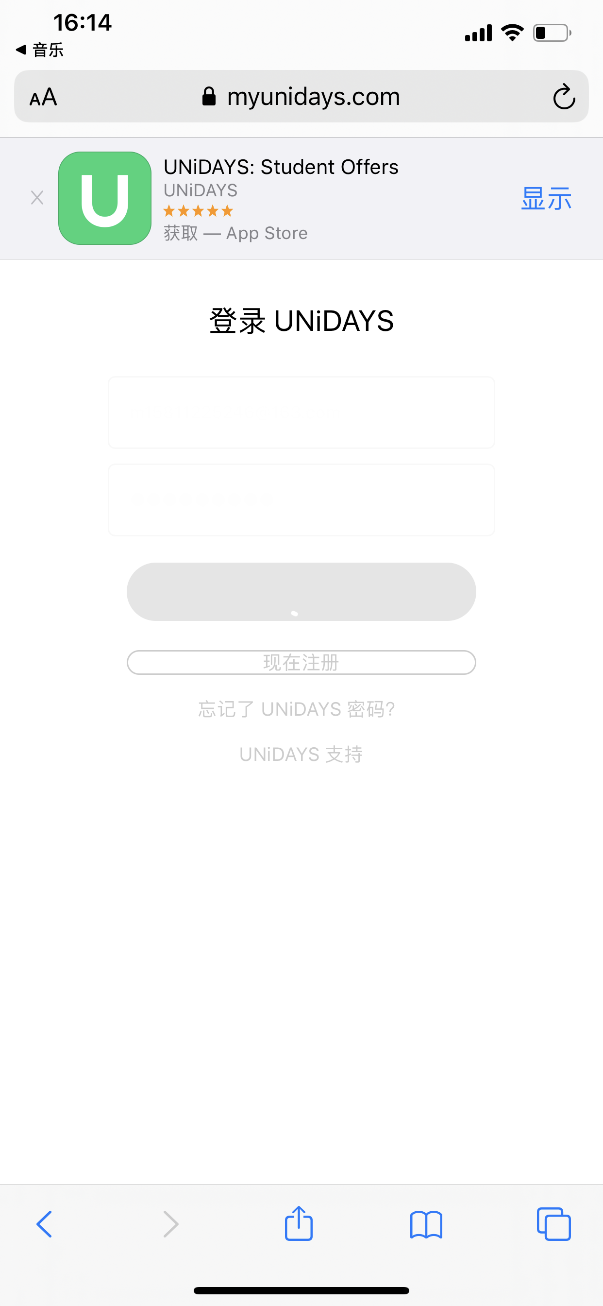 在Apple Music中选择大学生后验证资格的网页输入邮箱和密码后一直无跳转,一直转圈,如下图。