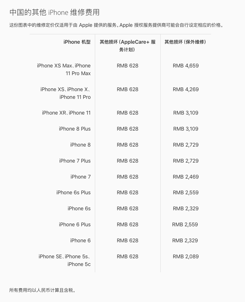 机器有物理损坏需要整机交换或维修有AppleCare+费用为RMB628,没有AppleCare+费用可查询iPhone 维修 - 官方 Apple 支持