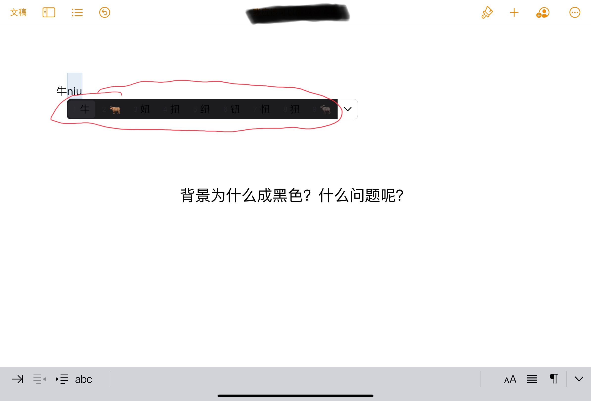 当我输入文字时,输入框的背景是白色的,字体是黑色的,很正常。但是当我结束这次输入,第二次进行输入的时候,弹出的输入框背景变为黑色,黑色的字体被淹没在背景之中,这时候输入框是一整片黑色,什么也看不清。但是当我盲点下拉符号“v”时,背景就恢复正常的白色了。这是什么问题呢?iPad出什么问题了?谢谢!