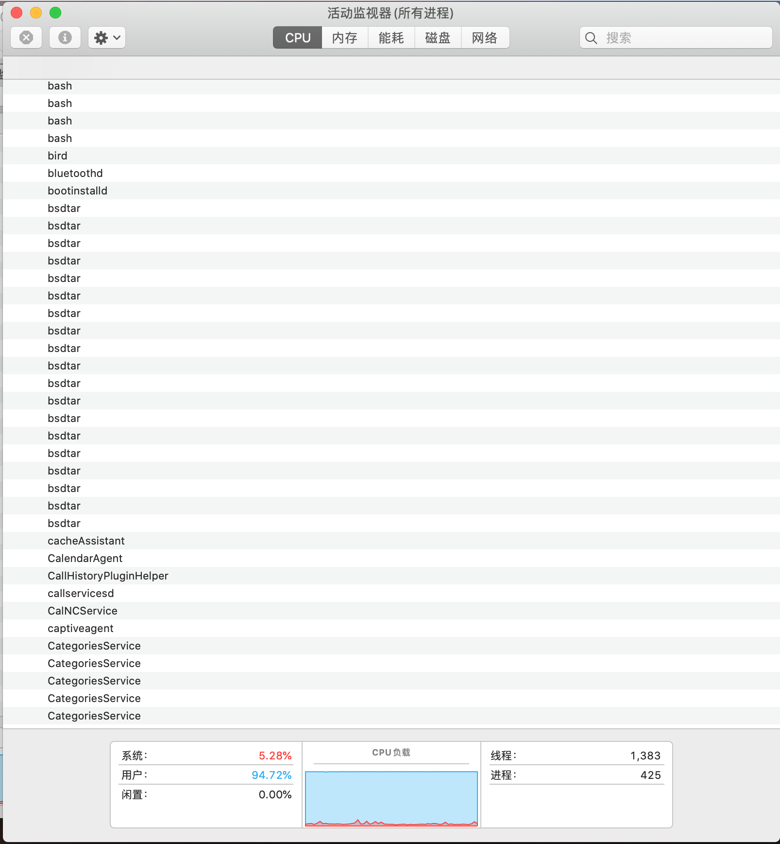 不定时随机性出现MacOS Catalina启动后异常进程bash、bsdtar等造成CPU满载风扇狂转,这个问题出现的概率比较高,50%的样子,重新启动后异常进程消失,系统正常。之后随机性又会出现启动后异常进程,问题重复性出现。