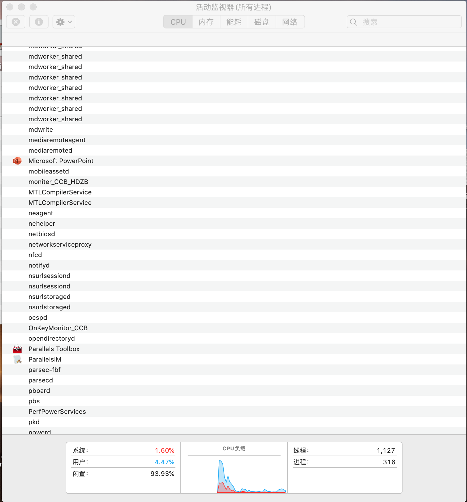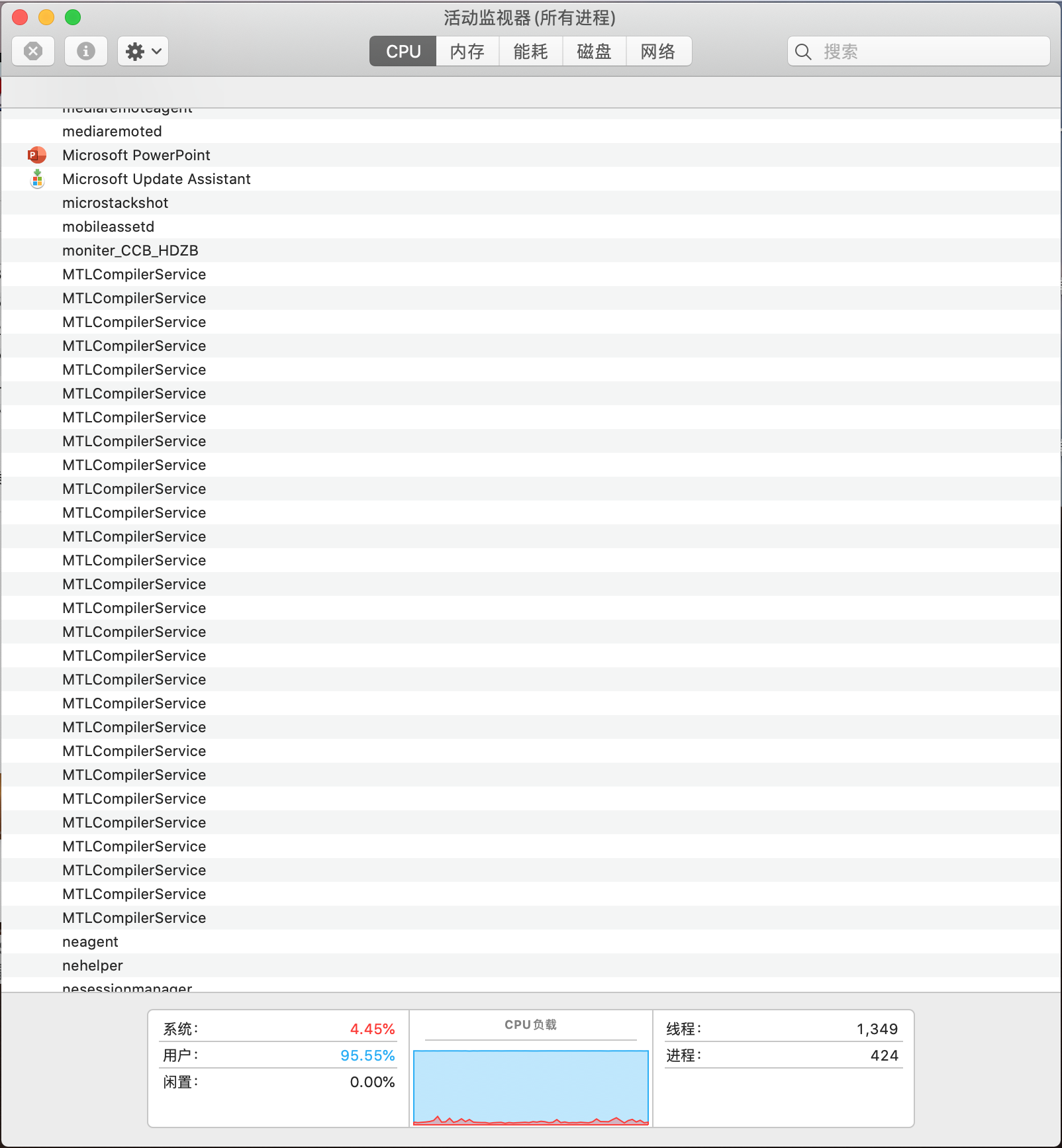 重新启动正常后bash、bsdtar进程没有了,MTLCompilerService进程数量减少到2个,CPU负载正常。