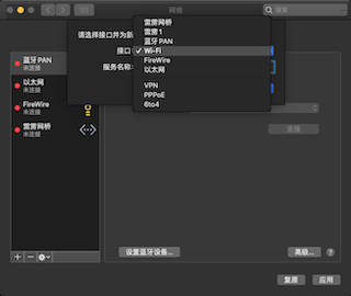 3> 如果 Wi-Fi 没有自动出现在, 网络系统偏好设置中,手动添加: 左边栏点“+”号, “接口”选择“Wi-Fi”, “服务名称”可以使用默认 (如下图), “应用”后, 尝试重新连接.