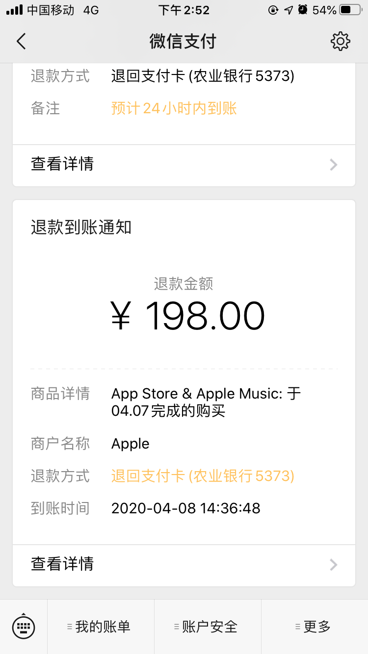 引用上文有名网友的回答:同志们,今早上我已经退款成功了,很快的,大家先下载一个Apple支持,然后登陆,找到iTunes Store - 订阅和购买 - 不明收费 - 立即与我们通话(2分钟内),然后客服马上就给你打电话了,然后按1随后向客服说明情况,很快客服核实情况后就会退款了,退款很快就会打到账户上,通话的时候就会到账了,所以不用挂电话等待,希望大家能及时解决,我感同身受。