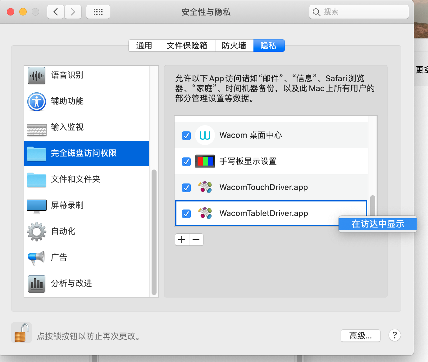 故将系统偏好设置---安全性和隐私---隐私内 所有能添加wacom驱动权限的地方全部添加wacom程序和驱动并重启。