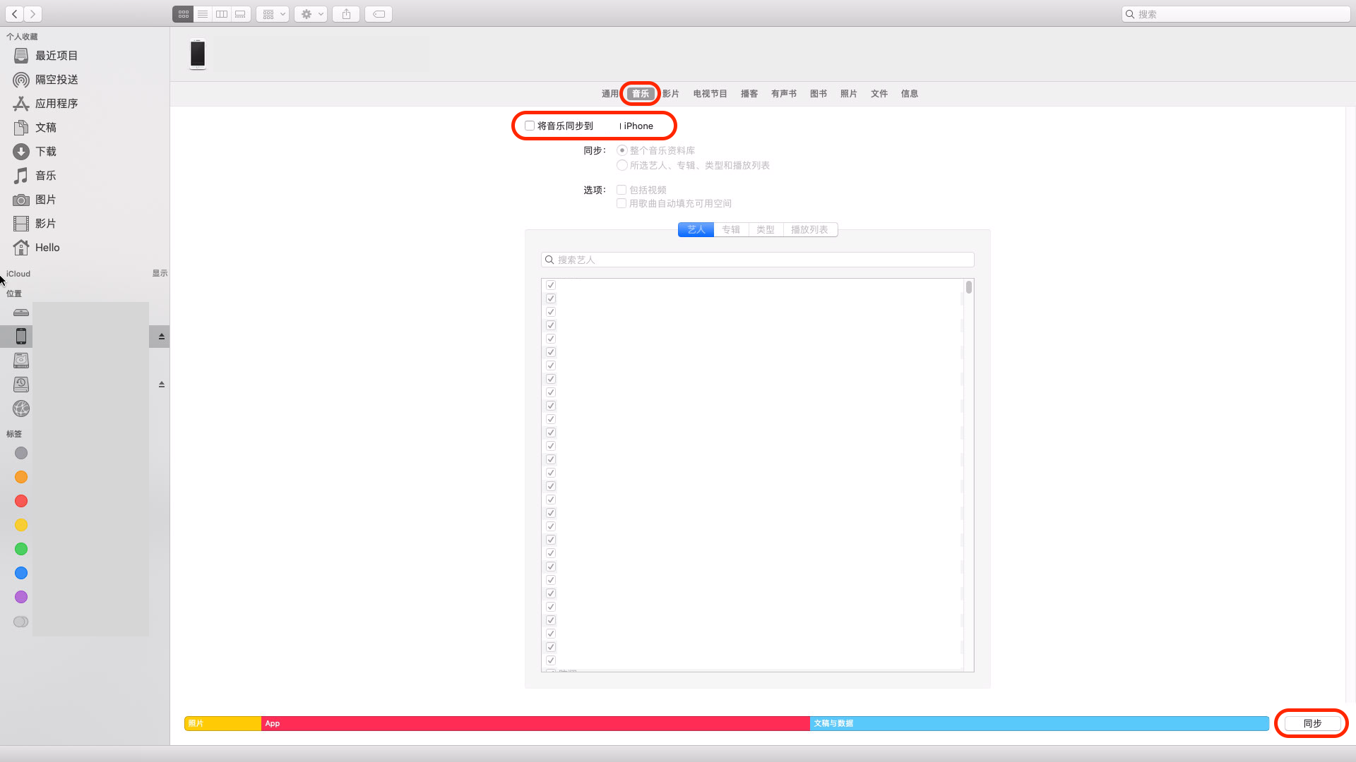 由于我一直在使用 Apple Music 所以不方尝试在新的访达里管理 iOS 设备手动同步音乐和视频,不过我建议你先在 Mac 音乐 app 中管理好音乐歌曲,然后在访达设备管理 - 音乐中勾选上“将音乐同步到 *** 的 iPhone ”并点击右下角的同步按钮,试试看。