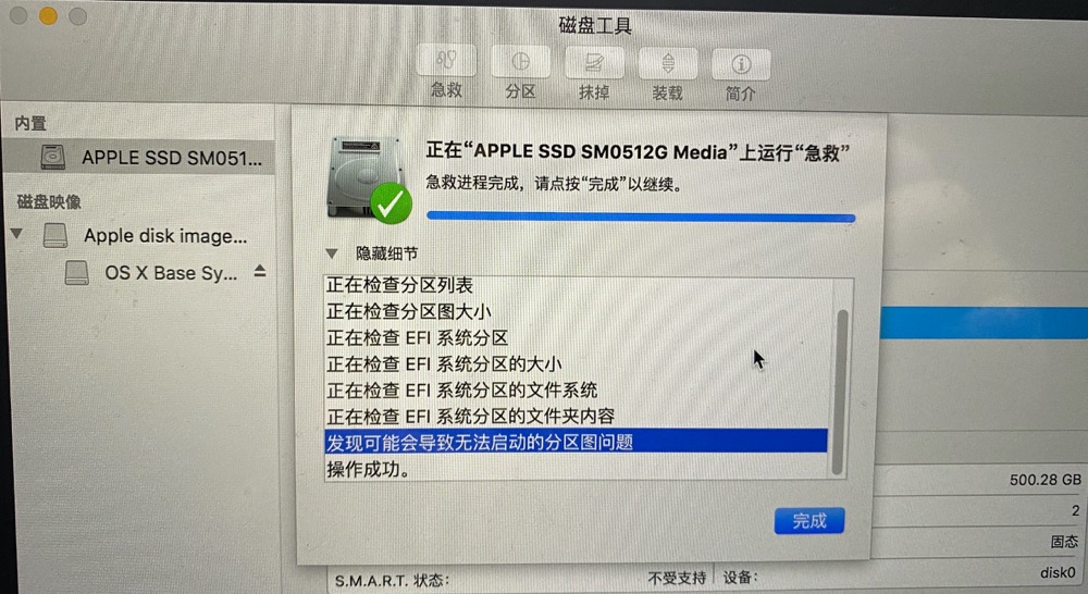 尝试1:按“Command+R”网络恢复,进入后在“磁盘工具”看不到自带的固态硬盘,点击“急救”也没有用,如下图所示: