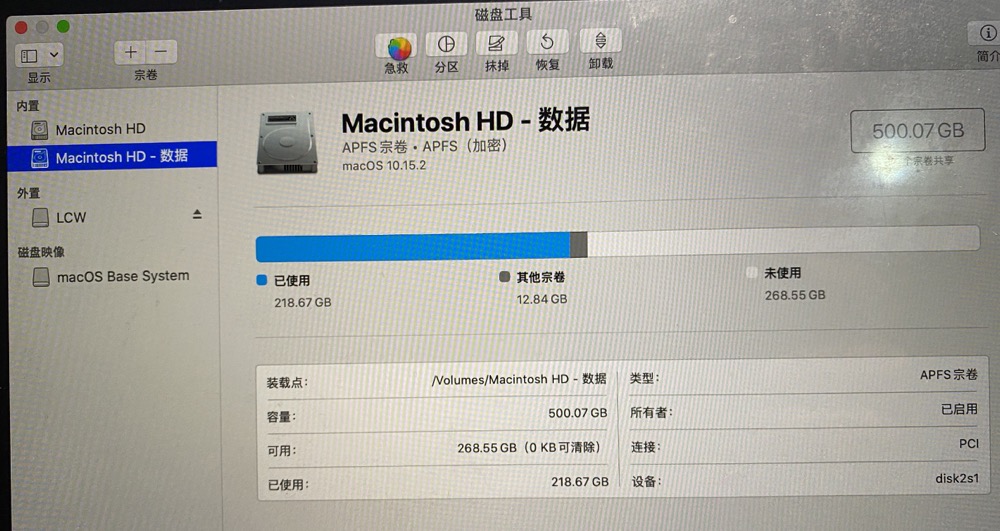 尝试2:按“Command+option+R”网络恢复,进入后输入原来账户的密码,再进入到“磁盘工具”后,能够看到自带的固态硬盘,以及两个卷宗。