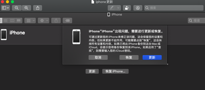 我在网上搜索了很多这个问题的解决方案,比较靠谱的是,选择iphone恢复模式,如果手机系统软件有可更新的系统的话,可以选择更新