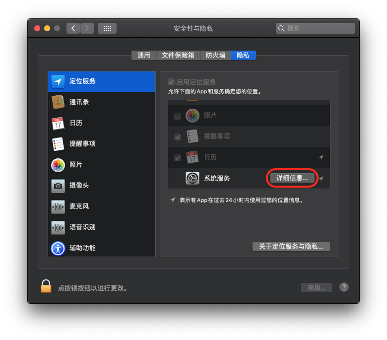 请问有没有检查过“系统偏好设置”-“安全性与隐私”-“隐私”-“定位服务”中“系统服务”右侧的“详细信息”按钮里的设定?