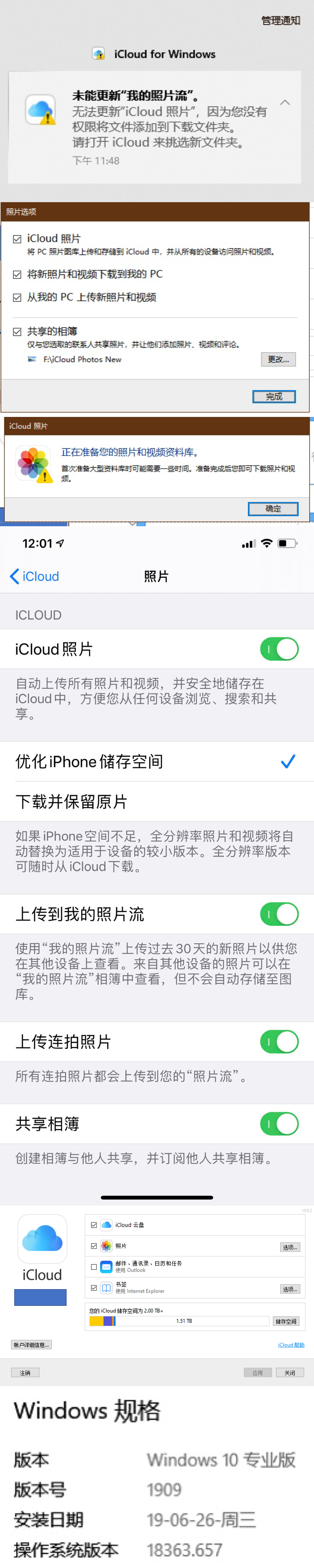 在我的笔记本或台式机上的iCloud客户端,都无法自动下载我iCloud账户里的照片。开启照片同步功能之后弹出提示“未能更新我的照片流”(如图1)。iCloud客户端的设置中,也不想网上其他教程那样,有选择下载到哪个文件夹的选项(如图2)。系统托盘中点击下载照片,则是提示正在准备,实际上不管电脑开着多长时间,都是这个提示不会变(如图3)。而不论我的iPhone或是iPad中,图片都是正常及时同步的,我在手机上的设置截图如图4。最后,我的系统版本:Win 10(1909)。iCloud客户端版本10.9.2。求助,谢谢!