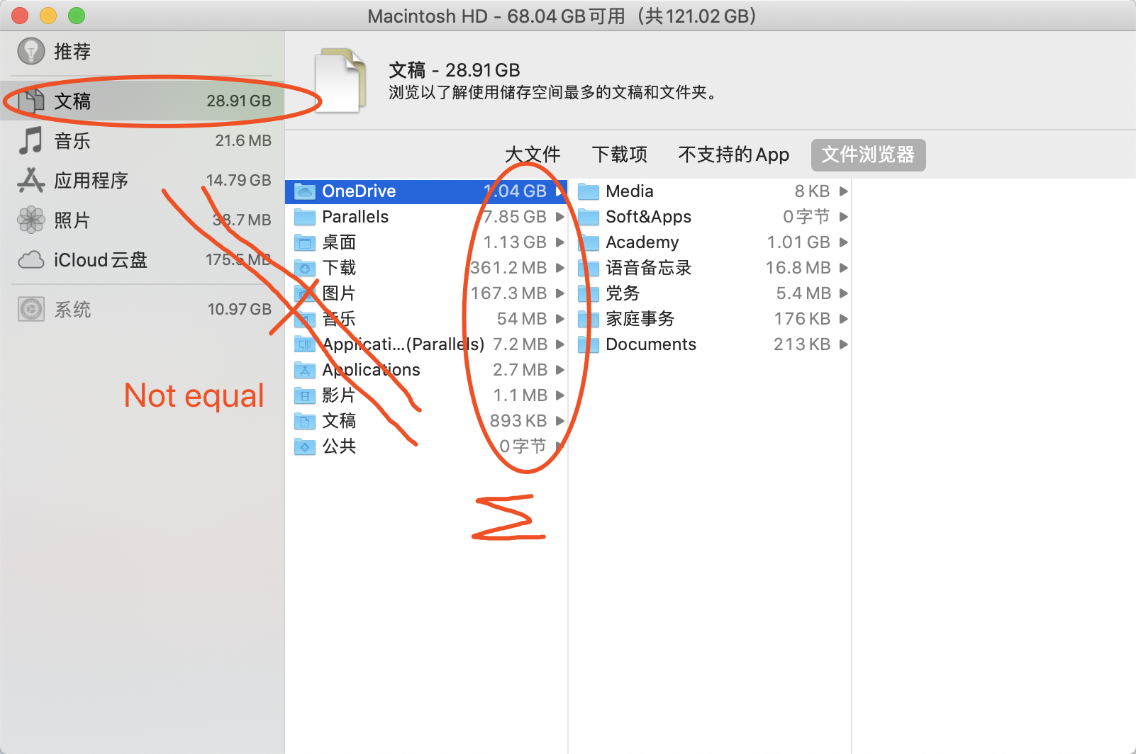 Onedrive在开启文件随选功能后,右键释放空间,但是着部分被存在云端的文件仍旧被记入macbook的硬盘存储空间中,暂不清楚是不是访达统计方式的问题,下面我用一张图直观的表现问题。我们可以看到,在“文稿”这一分类中Onedrive仅占用了1.04g,而在文稿这一类文档中,所有文件夹加起来远远没有左上角显示的28.91g之多,一定是系统计算方式的问题,下面我继续用一张图来说明问题。