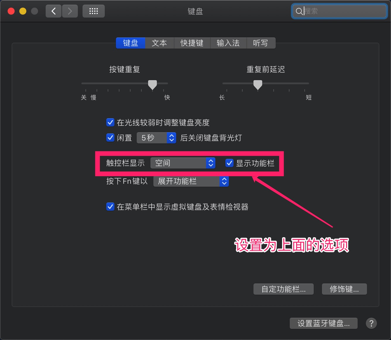 在键盘设置里的“触控栏”显示设置为“空间” 然后勾选“显示功能栏”选项。