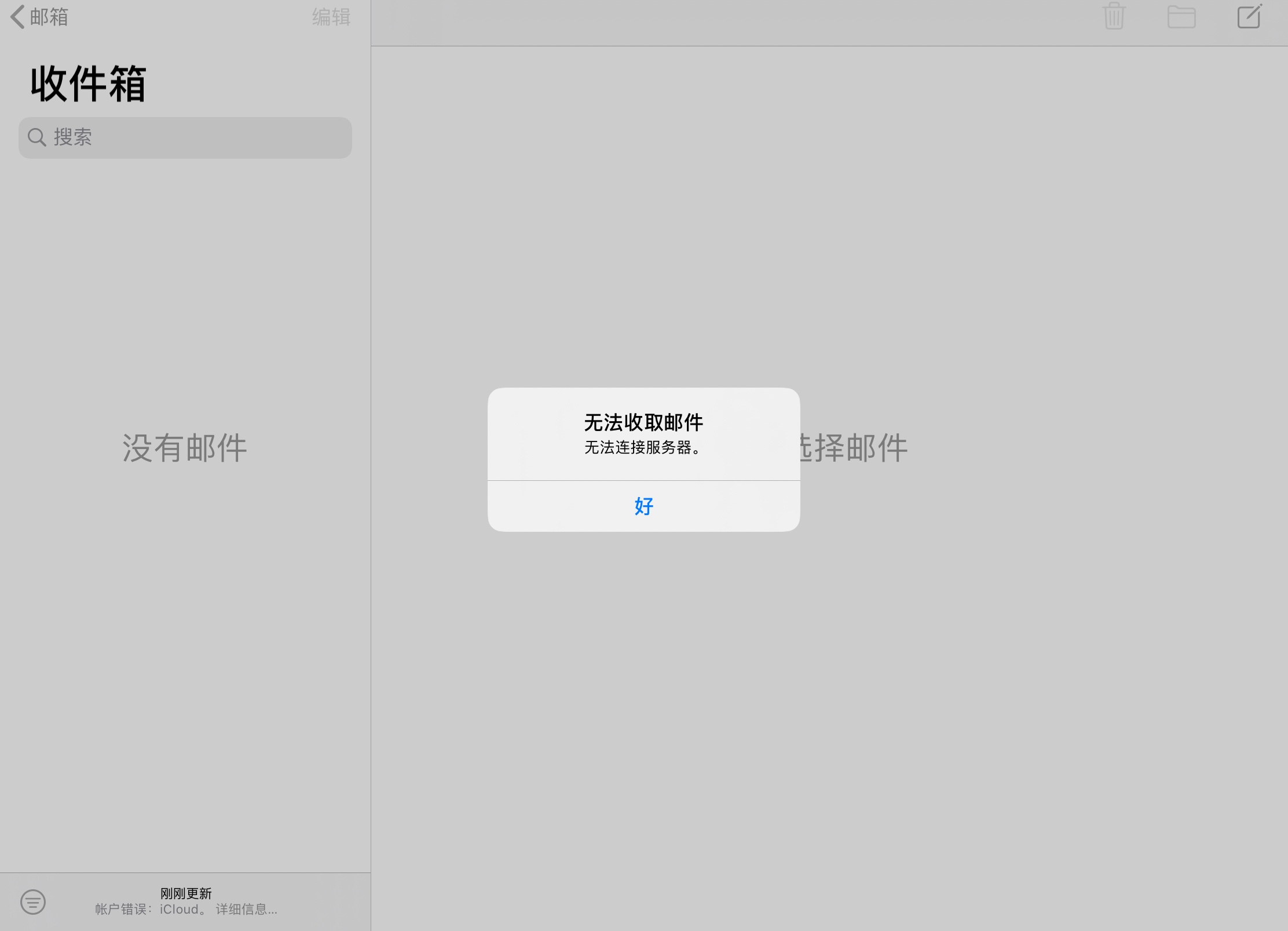 自带的邮件app登陆icloud邮箱后无法接收和发送邮件 问题如图