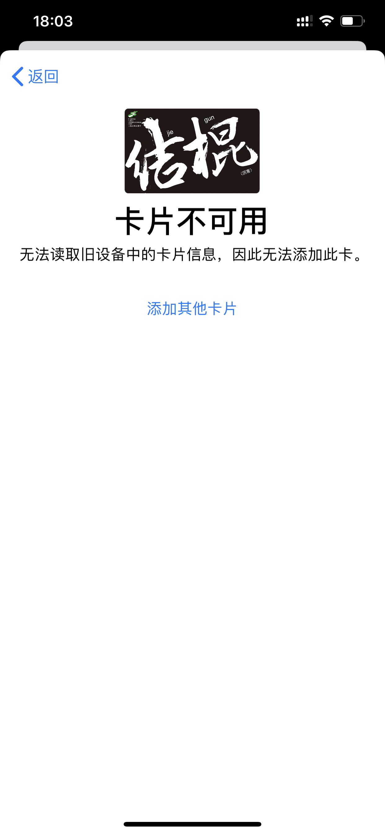 重启新设备后,在新设备中操作添加上海交通卡后,依然提示“无法读取旧设备中的卡片信息,因此无法添加此卡”。